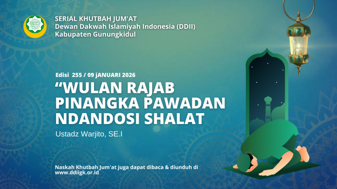 Sakmenika kita sampun wonten ing sak lebetipun wulan Rajab (Rejeb, jw). Salah setunggaling wulan ingkang dipun mulya-aken dening ngersa ndalem Gusti Allah SWT. Salah setunggal saking sekawan wulan haram, wulan inkang kebak kamulyan. Setunggal menika ingkang misah, wondene ingkang tiga menika urut, ingging menika Rajab, Dzulqa’dah, Dzulhijjah saha Muharram.